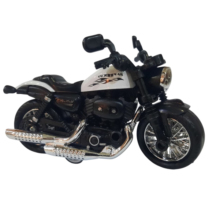 This die-cast toy motorcycle is a perfect miniature replica for kids and collectors alike. Designed with a detailed engine, realistic body structure, and chrome-style exhaust, it brings the thrill of a real motorbike in a compact size. The free-wheel feature allows smooth rolling on any flat surface, making it fun and engaging for children. Its durable metal and plastic construction ensures long-lasting play, while the stylish finish makes it great for display. A perfect gift for young bike lovers and miniature vehicle collectors.