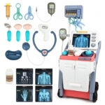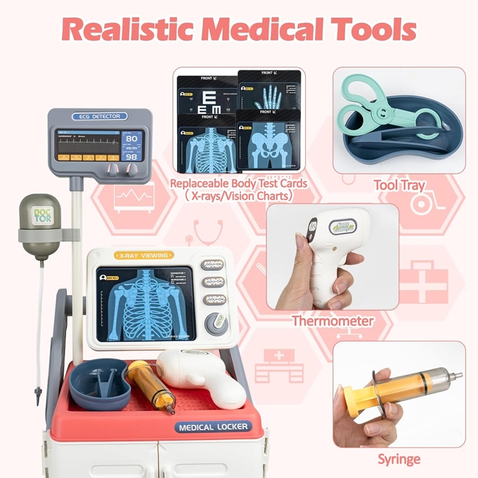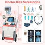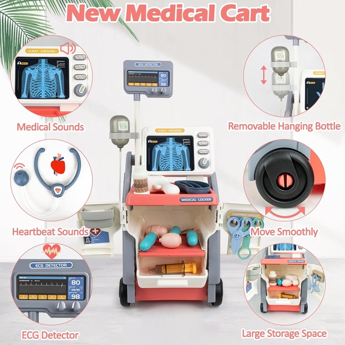 If your child wants to be a doctor, our toy doctor kit can make that dreams come true. Children can use creativity and imagination to do ‘body checkups’ for family and friends, learn about medical and health care in role-playing, and develop storage habits and hand-eye coordination. The medical cart station is sturdy and flexible. The hand-push design allows you to easily push the cart anywhere. The large space can store all the medical accessories and keep your home tidy after the doctor games. Our doctor station toy provide realistic play environment for kids. The child can change the physical test card according to different treatment needs. The stethoscope toy simulates the sound of a heartbeat. The medical screen buttons can also simulate the sound of the instruments. Multiple medical tools increase the fun of play. The toddler doctor playset is made of high quality plastic material, which contains physical test cards, vision chart, toy stethoscope, oral mirror, thermometer, hanging bottle and so on. Multiple accessories will allow your child to play for hours while increasing their knowledge of medical tools. Note: This toy is not suitable for children under three years old. Our doctor cart toy is specially designed for boys and girls who love role-playing games. It is suitable for party, birthdays, christmas and children’s day. The medical kits develop your child’s imagination and enhances medical knowledge during play.