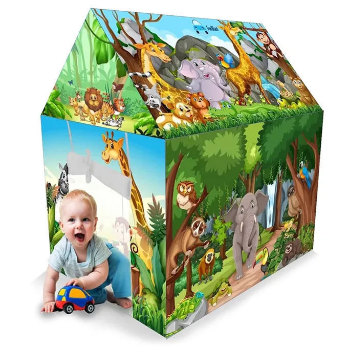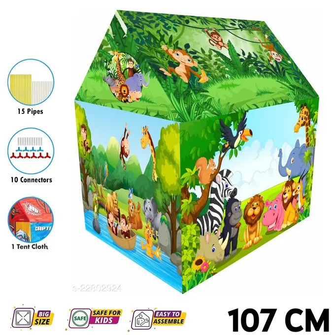 My Animal Jungle Book Theme Zoo PVC Vinyl Plastic Tent House Jumbo Size With Connectors and Pipes Set for Kids Easy to assemble Tent House Size: 95 X 72 X 107 Centimeters Play and stay Color graphics Quick and easy installation Your child will have hours of fun with this colorful play tent. Set it up in the backyard, and kids got a secret hiding place. It’s great for encouraging play, adventure and fun. It provides comfortable shelter for outdoor trips and activities This playhouse will bring out the imagination of your child whether playing make-believe alone or role-playing with others. It’ll help develop social skills and really bring out the creative side of your child that could lead to a future acting career No Tools Required!!! Extremely Lightweight , Water & Fire-Proof .The unique folding capabilities of this tent allow it to be taken down and stored anywhere in your home securely. It can also be packed easily and taken with you on special trips This kids’ playhouse is incomparably versatile. Apart from placing it in your house, you can also effortlessly set it up in your backyard, your garden or any other outdoor space Play House Tent For Kids Easy Setup A High Quality Vinyl Play Tent With My Animal Jungle Book Theme Zoo Design Easy To Assemble And Beautifully Designs, this Is A must For Summer or Indoor