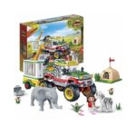 Jump behind the wheel of this tough jeep for an exciting safari. After you connected the trailer behind the jeep, you can go ahead. Be sure to take a camera, while you will see various beautiful animals on the way, producing unforgettable photos. But what do you see next to the path? Oh no, it is a sick giraffe! Place the giraffe in the cage and bring it to the ranger. He can take care of it. The ranger takes good care of the animal and soon, the giraffe can be set free in nature again. Another exciting adventure with the safari jeep! Build the tough safari jeep with cage with the BanBao building blocks.  Drive around in the jeep and play with the wild animals.This toy set consists of one safari jeep with cage, one tent, three Tobees, one elephant, one zebra, one camera, tools and a lot more.