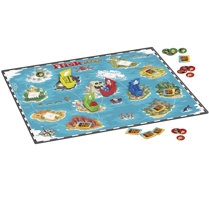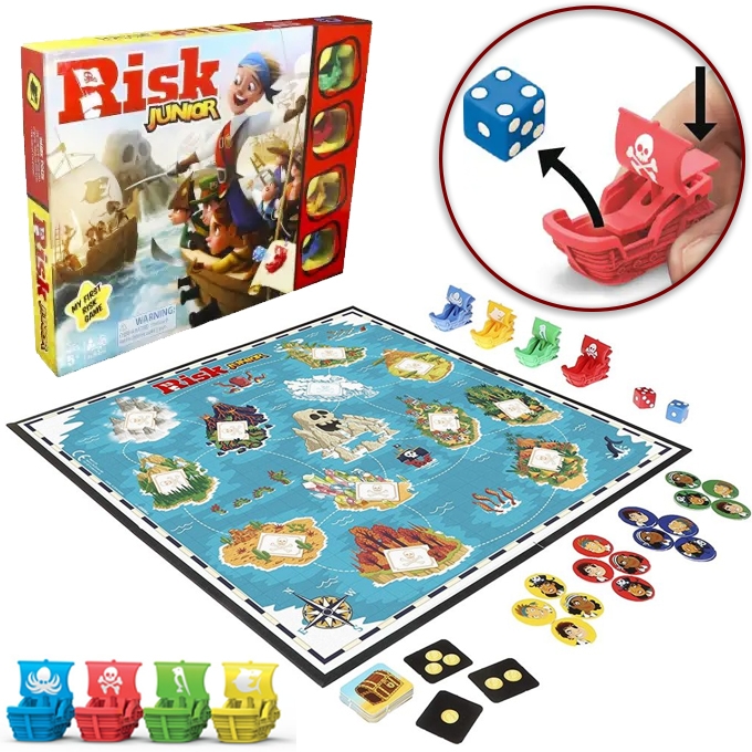 Risk Junior Strategy Board Game A Kid’s Intro to The Classic Game for Ages 5 and Up – Pirate Themed No.3138Y Battle for treasure on the high seas. What a great way to introduce kids to the iconic Risk brand. The Risk Jr. board game features easy-to-get gameplay, an engaging pirate theme, and bold, colorful artwork. Kids move their boat token around the game board in search of buried treasure as they battle for control of the islands, aiming to collect the most loot to win. The game requires no reading, is quick to set up, and can be played in less than 30 minutes. Engage family members ages 5 and up with this junior edition of the classic strategic combat game. the Risk Junior board game is a great way to introduce children to the strategy gameplay of the classic Risk game. The game is for children aged 5 and up; for 2 to 4 players the Risk Junior game’s pirate theme has children moving their pirate ship tokens around the board, competing for treasure and control of the islands place, press, launch! To battle another player to claim an island and its treasure, players put a die in their pirate ship, press the lever and launch it to discover the next move move pirates on to islands, defend territories and control treasures. The player with the most treasure and islands at the end of the game wins the Risk Jr. game is a great way to introduce children to the classic strategy board game. It makes a great gift for children aged 5 and up.
