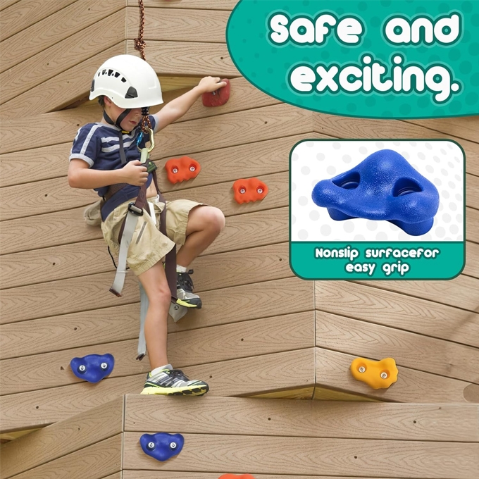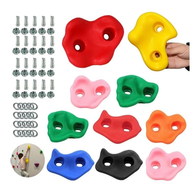It Is Made Of High-quality And Durable Plastic Resin, Which Is Sturdy And Durable. Our Rock Supports Are Designed For Outdoor Weather Conditions And Indoor Environments. Our Equipment Is Equipped With Everything You Need, Which Can Be Easily Installed On The Board, And Is Equipped With Set Screws And Installation Wrenches. Let Your Little Toes Climb Indoors Or Outdoors Today. Build Your Own Climbing Wall In The Backyard Or Indoors! Children As Young As 4 Can Start Climbing. Customize The Wall Pattern And Adjust The Retention According To The Preferred Difficulty Level. Be Creative, Have Fun, And Move On! Climbing Can Stimulate Children’s Vitality, Exercise Their Strength And Agility, Strength, Coordination, And Also Exercise Their Balance Ability, Making Them More Brave And Independent. The Rock Wall Bracket Has 5 Colors, Namely Red, Blue, Green, Yellow And Brown, And Has 3 Shapes, Including Wrench, Screw And Washer. It Can Create Unique Rock Walls.