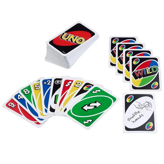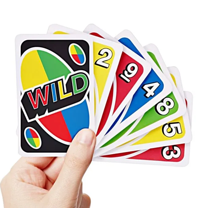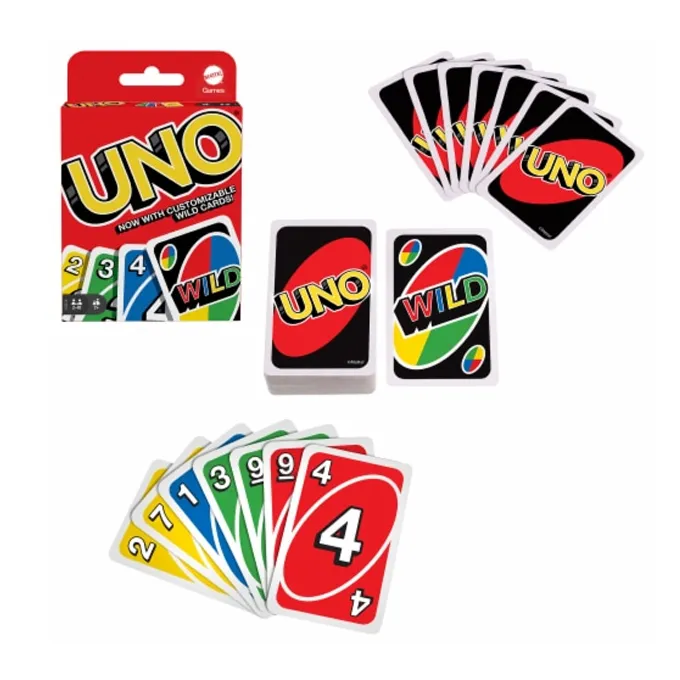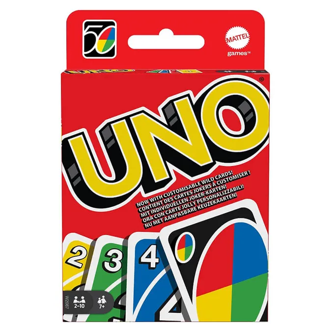 UNO is the classic card game of matching colours and numbers that is easy to pick up…impossible to put down and now comes with customizable Wild Cards for added excitement. Players take turns racing to get rid of all their cards by matching a card in their hand with the current card shown on top of the deck either by colour or number. Special Action cards deliver game-changing moments and help defeat opponents. Use the Swap Hands card to change hands with any other opponent and write your own rules using the 3 customizable (and erasable) Wild Cards. You’ll find 19 of each colour (red, green, blue and yellow), plus 8 Draw Two, Reverse and Skip cards in every colour, along with 4 Wild Cards, 4 Wild Draw Four cards, 1 Wild Swap Hands Card and 3 Wild Customizable cards. If you can”t make a match, you must draw from the central pile. Don’t forget to shout UNO when you only have one card remaining. The player to rid themselves of all the cards in their hand scores points for any cards their opponents are left holding. The first player to reach 500 points wins. Get Wild 4 UNO. Includes 112 cards and instructions. Each sold separately, subject to availability. colours and decorations may vary.